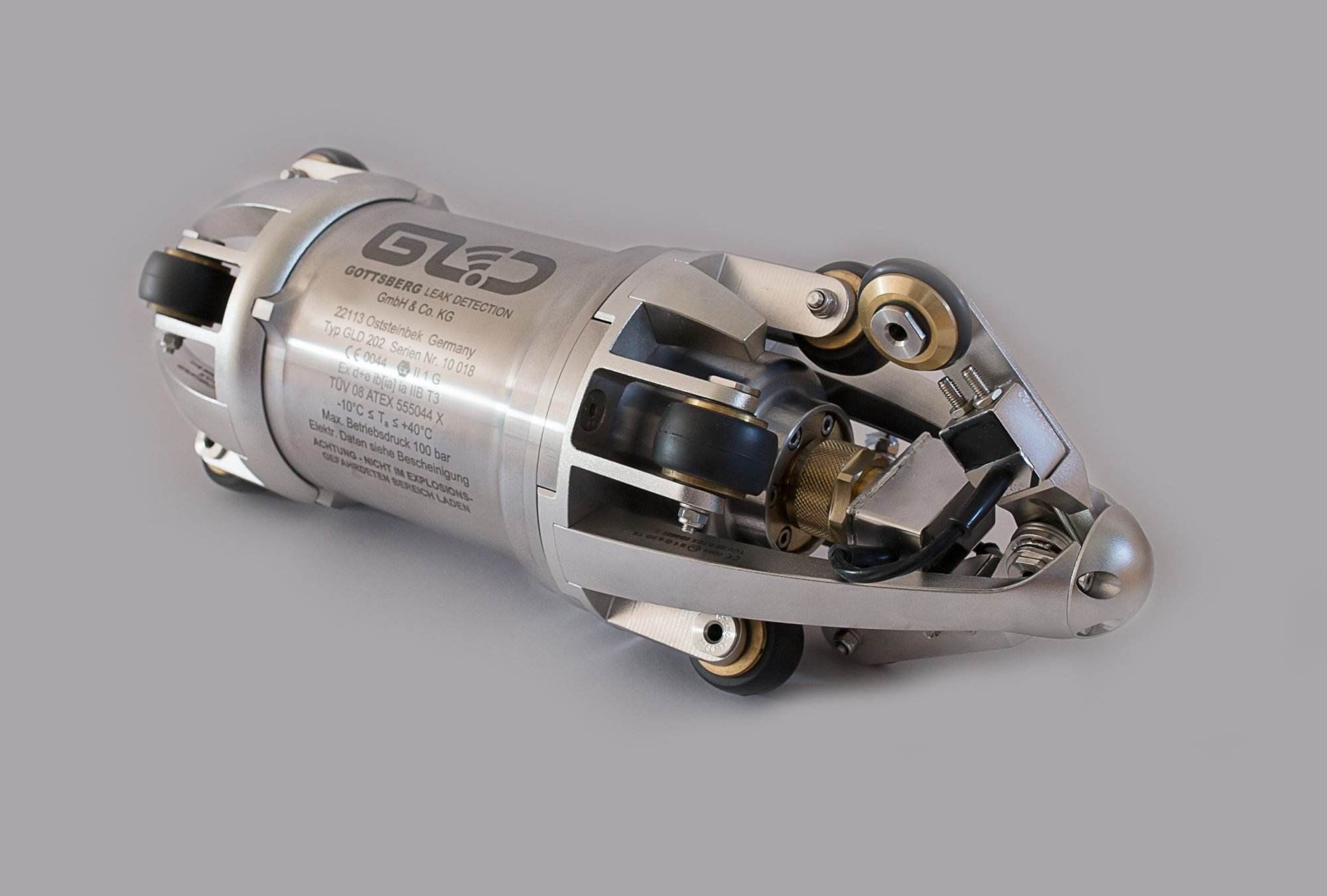 Der GLD 20x Leckdetektor ist druckdicht und explosionsgeschützt konstruiert. Er ist zertifiziert für ATEX-Zone 0. Dies ist weltweit einzigartig. Der Detektor wird in einem an die Größe der Rohrleitung angepassten Fahrgestell GLD 30x montiert, als Einheit bilden beide zusammen den GLD-Molch. Dieser Molch ist modular aufgebaut, d.h. Sie können den GLD 20x Leckdetektor in GLD 30x Fahrgestellen verschiedener Größe montieren, um so verschiedene Rohrdurchmesser zu molchen.