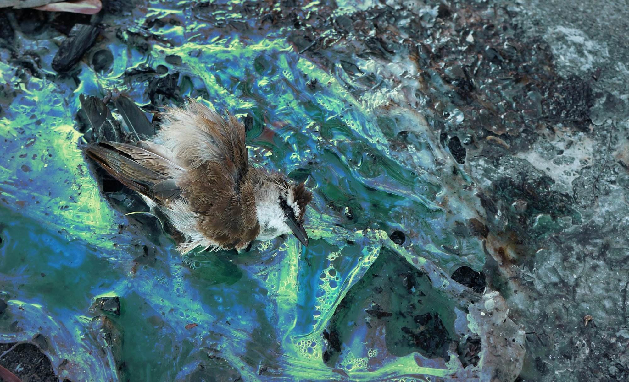 Verendeter Vogel durch Ölverschmutzung einer undichten Pipeline.